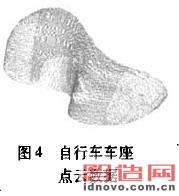 以下給出的是利用Imageware與Pro/E結合進行逆向建模的例子。圖4是一個自行車車座的點云數據圖;圖5是在Image二中利用有關點云處理功能提取出的截面特征曲線示意圖,圖6是以提取出的截面特征曲線作為邊界,并在相鄰曲面片間的公共連接邊處設置相切約束后,輸人Pro/E中構造的曲面模型。