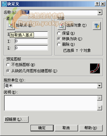 圈選這段做好的法蘭,點(diǎn)快捷鍵“B”創(chuàng)建塊,輸入名稱(chēng)并拾取法蘭的一個(gè)端點(diǎn)作為基點(diǎn),點(diǎn)確定完成塊的創(chuàng)建。