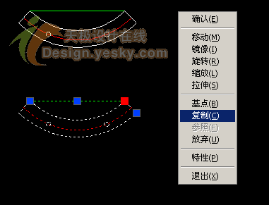 現(xiàn)在分段法蘭的塊已經(jīng)做好了,用旋轉(zhuǎn)工具把法蘭塊順時(shí)針旋轉(zhuǎn)45度,水平放置,連接法蘭內(nèi)徑端點(diǎn)做輔助線(xiàn)段,這里我們選取綠色作為輔助線(xiàn)的顏色。選中法蘭的塊與輔助線(xiàn)段,使用F8鍵打開(kāi)正交,點(diǎn)擊其中的一個(gè)節(jié)點(diǎn),右鍵使用移動(dòng)-復(fù)制命令,在垂直方向上拉開(kāi)一定距離復(fù)制同樣的塊與輔助線(xiàn)段(如圖)。
