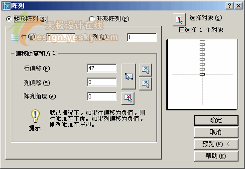 下面就要用上我們剛才畫(huà)的輔助線(xiàn)段了,使用線(xiàn)性標(biāo)注工具,量取兩條輔助線(xiàn)段之間的距離,記下這個(gè)數(shù)值備用。刪除這兩條輔助線(xiàn)段,刪除其中一個(gè)法蘭塊。選中留下的那個(gè)法蘭塊,使用ARRAY(陣列工具),在陣列對(duì)話(huà)框中選中矩形陣列,在行中填寫(xiě)我們需要的法蘭塊數(shù)量,這里筆者填寫(xiě)的是8;在列中填寫(xiě)1;行偏移中填寫(xiě)剛才我們記下的兩條輔助線(xiàn)段間的距離數(shù)值,為了保險(xiǎn)起見(jiàn),我們可以稍微填寫(xiě)的大一點(diǎn)點(diǎn);列偏移中填寫(xiě)0,陣列角度為0: