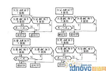 采用矢量法來(lái)判別三角形ABC的方向。為便于編程,按如下原則將矢量方向所屬象限分類。設(shè)點(diǎn)A(xA,yA),B(xB,yB),C(xC,yc),則AB=OB-OA=(xBi yBj)-(xAi yAj)=(xB-xA)i-(yB-yA)j