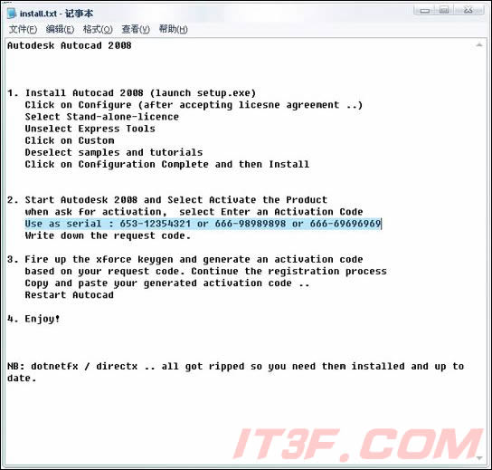 在原來的解壓文件CD1中找到“AutoCAD.2008.Keygen.Only-XFORCE”文件夾,打開里面的記事本文件install.txt,里面有需要的序列號,一共三個,隨便用一個就行。