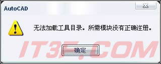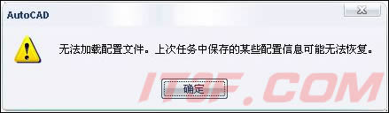 11、如果啟動CAD2008的時候,出現“無法加載配置文件。上次任務中保存的某些配置信息可能無法恢復。”對話框。或者在使用過程中(比如切換到“三維建模”工作空間),出現“無法加載工具目錄。所需模塊沒有正確注冊。”對話框。