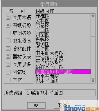 先用WPS、EDIT等編輯程序分類建立詞組庫(注意,需要存成純文本格式),每個詞組占一行。程序要求將"常用術語"、"圖紙名稱"、" 房間名稱"等各分類所對應的詞組庫文件名分別為$TXT1.DAT、$TXT2.DAT、$TXT3.DAT厖。除第一個文件不能少外,其它文件可空缺,但當點取該分類項時,系統會提示有關文件不存在的信息。