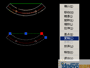 現在分段法蘭的塊已經做好了,用旋轉工具把法蘭塊順時針旋轉45度,水平放置,連接法蘭內徑端點做輔助線段,這里我們選取綠色作為輔助線的顏色。選中法蘭的塊與輔助線段,使用F8鍵打開正交,點擊其中的一個節點,右鍵使用移動-復制命令,在垂直方向上拉開一定距離復制同樣的塊與輔助線段(如圖)。