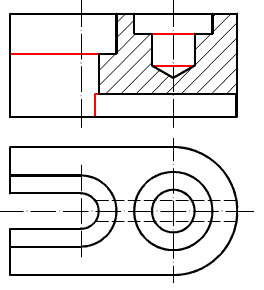(3)分析剖切后的輪廓線的可見性,注意可見輪廓線應全部畫出,不能遺漏,剖視圖中一般不畫不可見輪廓線。對于已經表達清楚的結構,其虛線可以省略不畫。但如果仍有表達不清的部位,其虛線則不能省略。(本例沒有不可見輪廓線)。