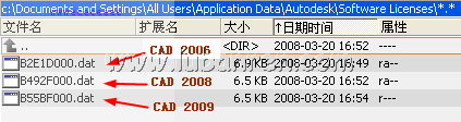 上述目錄中的B*.dat文件就是。如果安裝了多個版本的話,會有多個文件,因此,如果全部刪除就得把你機器里的所有CAD重新再激活一次了,下圖是偶機器里的三個文件,不知是否文件名不變,供參考。