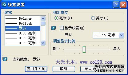 打開線寬設(shè)置,就可以看到默認(rèn)線寬是0.25,當(dāng)然你也可以設(shè)置成0.30或者0.50等等,這下我們知道了CAD默認(rèn)線寬是0.25mm