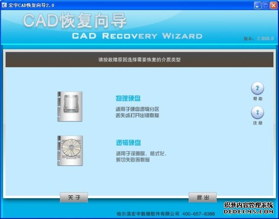 此cad文件修復器宏宇CAD恢復向導2.0,主要是用于查找和恢復因誤刪除,格式化,病毒破壞等原因丟失的DWG工程文件。全中文向導式三步界面。綠色國產,免安裝,擁有高速搜索引擎,支持多種版本AutoDesk公司的 2000版本、2002版本、 2004版本、 2005版本、 2006版本及最新的AUTOCAD2008版本的DWG文件格式都可以恢復,支持對多種文件系統的搜索,支持查找結果自動過濾,支持按文件內部信息自動命名整理輸出。專用算法對文件一致性檢查,提高恢復結果的可靠性和實用性。通過宏宇旗下數據修復中心多名工程師嚴格專業測試。較適用于文件目錄登記項嚴重丟失的CAD文件恢復。