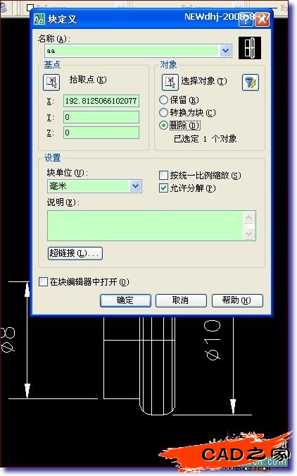 2、對象定義塊,取名aa ,拾取點在圓心,確定