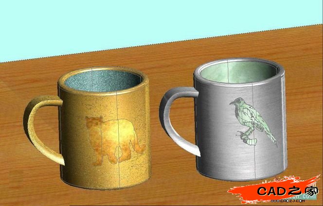 左邊杯子:先將材質(zhì)1(淺黃金色)附給整個三維體,然后再分別著色。為了使老虎圖案與杯面顏色有別,所以選擇了材質(zhì)3,怎樣附給老虎圖案呢?按住Ctrl鍵后,在杯面擺動鼠標,當老虎圖案線框發(fā)亮時,擊鼠標左鍵就將云狀黃金材質(zhì)附給它了;接著選擇“粹花玻璃”材質(zhì)來附給杯內(nèi)線框,仍按住Ctrl鍵,并在杯口內(nèi)擺動鼠標,當口杯內(nèi)線框發(fā)亮時,擊鼠標左鍵杯內(nèi)就附給此粹花玻璃材質(zhì)了。