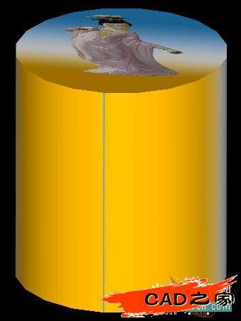 這里是說要在柱體正面顯示全圖像,而頂面及底面顯示顏色,具體方法是:當“新建材質”后,擊“渲染/貼圖“按鈕,在彈出的“貼圖”卡上點擊“柱坐標”及其“調整坐標”按鈕,在彈出的“調整柱坐標“卡上,擊”調整圖位“按鈕,并取“比例”值為2.5左右。如果圖案不適中。則再擊“視圖/三維動態觀察器”命令,予以旋轉調整就位。如下就是這樣調整的。