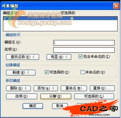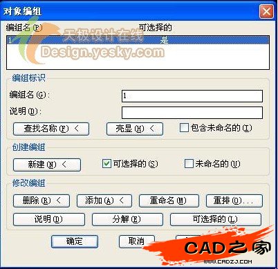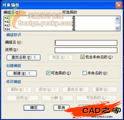 我初步認為這個組合是編組,便在命令行中敲了GROUP命令,打開“對象編組”命令對話框。如圖二: