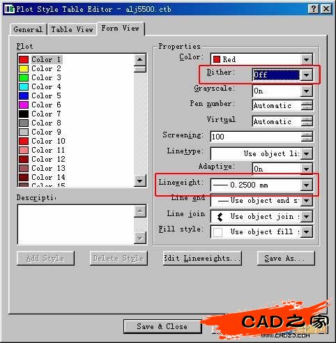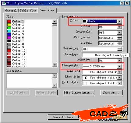同方法一一樣,只是在編輯打印樣式表時不用修改抖動選項以及灰度選項,把color 均修改為黑色,線性寬度還是按上述方法設定。
