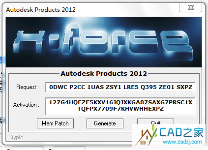 打開CAD 2012 64位軟件注冊機(WIN7需要“以管理員身份運行”)。首先點一下“Mem Patch"按鈕。然后把申請號粘貼到上面的文本框中,再點一下“Generate”按鈕。這時在下面的文本框中就會出現激活碼了。復制所有的激活碼。