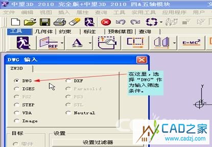 3、 進(jìn)入草繪空間之后,選擇“文件”菜單下的“輸入”子菜單,彈出“輸入”對(duì)話框(由于前一次默認(rèn)選擇為DWG,所以對(duì)話框標(biāo)題欄顯示為“DWG輸入”),見圖五所示:
