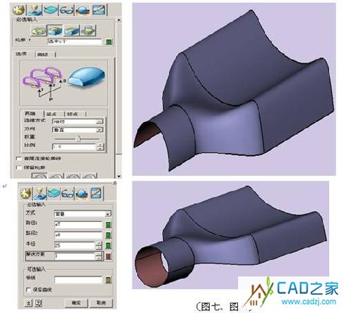 七、單擊放樣命令 ,選擇兩個拉伸特征的邊,放樣后見圖七。