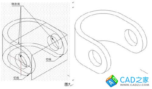 按F5鍵,將光標切換到右平面,利用line命令捕捉頂平面和底平面外環體切點繪制一條切線;再將光標切換到左平面,利用橢圓命令ellipse(同心圓I)以軸孔中心線交點為圓心繪制直徑為30和16的圓,修剪結果如圖七所示。