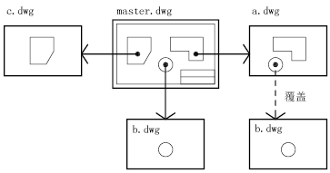 在以下插圖中,有多個用戶使用 master.dwg 所參照的圖形。使用 a.dwg 的用戶需要查看將由使用 b.dwg 的用戶完成的工作,但是不需要對 b.dwg 進行外部參照,因為那樣它將在 master.dwg 中顯示兩次。但是,用戶可以覆蓋 b.dwg,因為當 master.dwg 對 a.dwg 進行外部參照時,并不包括它。
