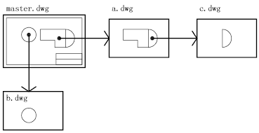 在以下插圖中,圖形 master.dwg 參照圖形 a.dwg 和圖形 b.dwg。圖形 a.dwg 參照圖形 c.dwg。在圖形 master.dwg 中,圖形 c.dwg 是嵌套的外部參照。