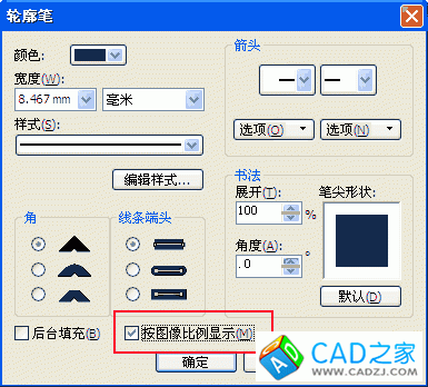 然后導(dǎo)入到CorelDraw里面,選中線條,調(diào)用輪廓工具(快鍵F12)更改其屬性,勾選“按圖像比例顯示”。再全選,按Ctrl+R(重復(fù)剛才的設(shè)置)。