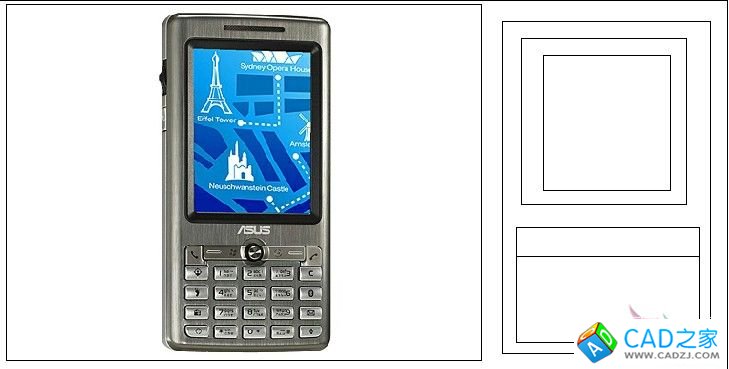 Step2.框架勾勒首先可以找到手機的實圖,插入到CAD中作為參考。精確起見,最好用尺子量取手機的精確尺寸然后參照實圖將手機的二維俯視圖先勾勒出來 命令:Rectang/Line