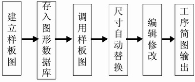 該方法的原理:采用基于工藝樣板圖尺寸置換的方法,即預先建立好樣板圖,然后自動調入樣板圖,將來自工藝數據庫中的尺寸信息載入樣板,即得到工序簡圖。該方法的優點是簡單、方便。基于樣板圖的自動生成流程如圖1所示。