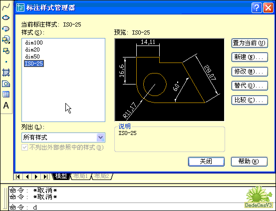 1,繪圖環(huán)境設(shè)置 圖層、文字樣式、尺寸樣式等。關(guān)鍵在于設(shè)置用于三個(gè)不同比例的圖形的標(biāo)注樣式(dim100、dim50、dim20)。