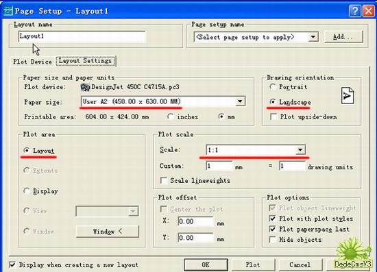 選擇打印機(jī)(我的HP450C)、圖紙尺寸User-A2(我的自定義尺寸630x450)、選擇打印范圍、打印比例、打印樣式等……