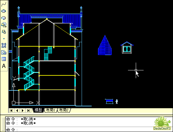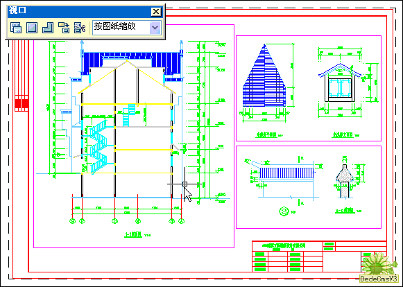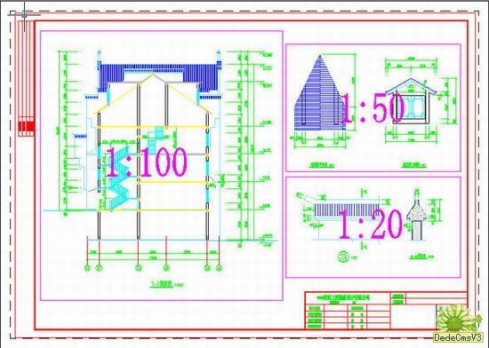 由于各圖需要在模型空間打印在同一張圖紙上,因此各圖的打印比例是一樣的,這里按1:100打印。為了使老虎窗的兩個(gè)圖1:100打印出來(lái)后為1:50的圖,因此事先把它放大2倍。同理,另兩個(gè)大樣放大5倍,以使1:100打印后實(shí)為1:20的圖。