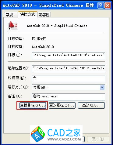 第一種方法:首先,您應該找到CAD軟件的安裝目錄,比如說,我的電腦上AutoCAD 2010 - Simplified Chinese這個版本,那您右鍵桌面上“AutoCAD 2010 - Simplified Chinese”快捷方式,找到最下面的屬性,彈出屬性對話框: