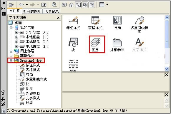 按ctrl+2鍵打開設計中心,然后在左上方的樹形圖中,按照保存路徑,找到你要調用其圖層的文件并雙擊,在右上方會出現這個文檔的圖層、文字樣式、標注樣式、以及塊等內容。