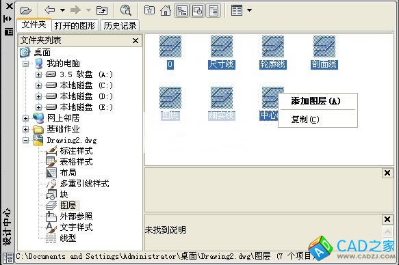 雙擊“圖層”,就可以看到這個文件里面的所有圖層了。此時選中你要添加的圖層,單擊右鍵選擇“添加圖層”,(直接將選中的圖層拖到繪圖區也可以)這樣選中圖層的所有特性,包括線型,都會調到你的空白文檔里來。
