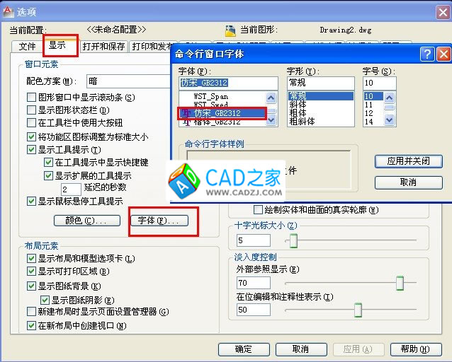在繪圖區單擊鼠標右鍵,選擇”選項”,在選項對話框中,點擊“顯示”選項卡,然后點擊“字體”,在彈出的對話框里,選擇命令行,按照需要更改其字體即可,這里還可以更改命令行文字的大小。