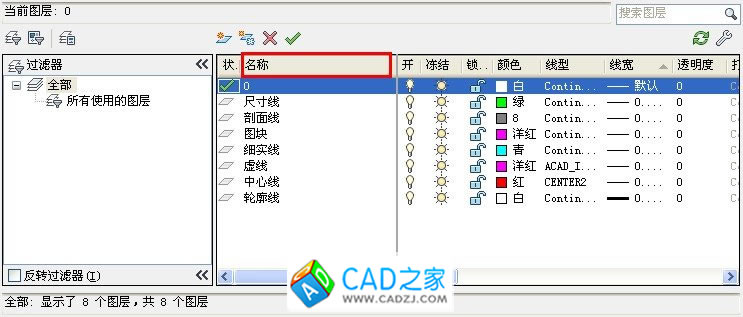 執行“LA”命令,打開圖層特性管理器,然后點擊列標題“名稱”即可