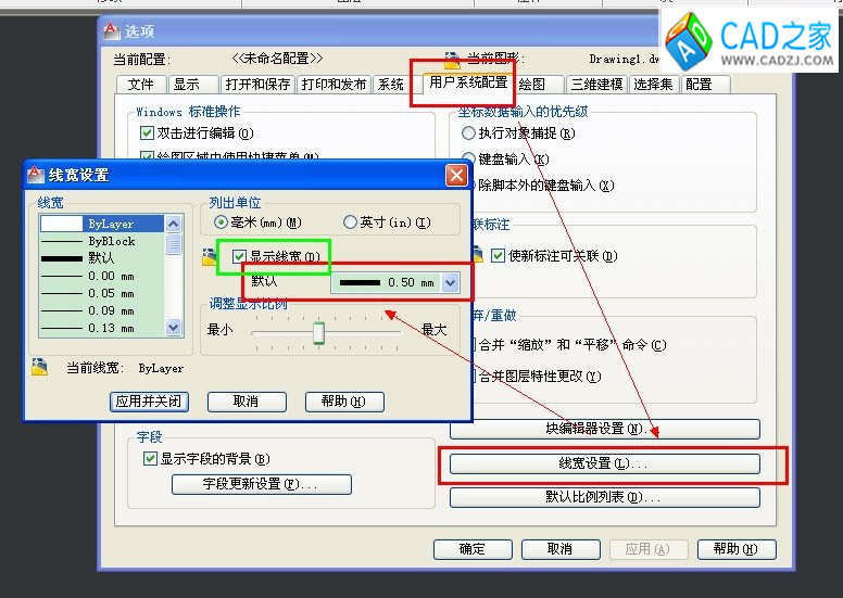 可以在【工具】或繪圖工作區點擊右鍵-【選項】-用戶系統配置—線寬設置,設置我們需要的默認線寬,勾選顯示線寬,就可在顯示其上展現不同線寬的顯示效果,當然不勾選打印出的圖紙線寬也是按照設置值輸出的。