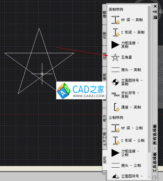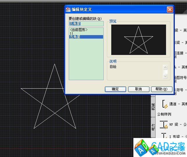 我們可首先繪制后一個圖塊,注意要創建成塊后進行保存,保存的文件即為“源文件”例如我們創建一個五角星結構:
