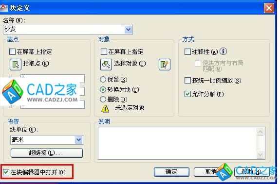 從新執行“BLOCK”命令,在塊定義對話框中,將“在塊編輯器對話框打開”的對勾去掉,創建一個塊,這樣以后再打開塊定義對話框,這個選項就不會自動勾選了。