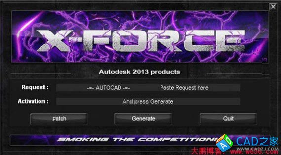 6)、將AutoCAD 2013激活界面中的申請號復制到注冊機(注冊機暫時不提供,就別跟我這里要了)的Request項中,然后點擊Generate(生成),就會在Activation框中生成激活碼。