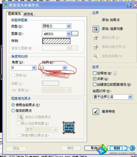 輸入填充命令H 確定,出現(xiàn)下圖對話框,標紅圈的地方就可以設(shè)置填充比例了