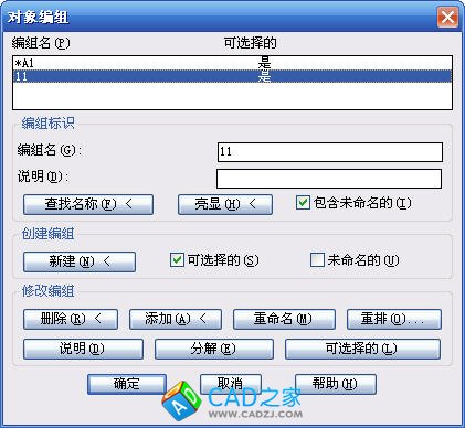 從上圖中可以看到組名有兩種,一種是帶星號(hào)的,一種是不帶星號(hào)的,帶星號(hào)的叫未命名組。(跟圖塊名字帶星號(hào)的叫未命名塊或匿名塊一樣)未命名組就是你懶得給組起名字了,讓軟件自動(dòng)生成一個(gè),通常是按*A123...這樣往下排。當(dāng)你新建組前勾選了后面的“未命名的”時(shí),你就不用在上面的編組名中輸入名字了,如果不勾選的話(huà),就必須在上面的編組名欄中輸入一個(gè)名字。起不起名字,名字怎么起取決你將來(lái)要怎么用這個(gè)組,如果編組只是為了點(diǎn)選,取不取名就不重要了,如果你希望通過(guò)名字來(lái)選擇組的話(huà),最好起一個(gè)易記、易輸入的名字。