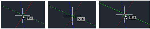 光標停留在圖中所示位置,按TAB鍵可以捕捉到三條線的交點、中點、端點等,切換過程中不僅會出現捕捉標記,相關的圖形會虛線顯示,讓我們清楚地知道是哪條線的中點或是哪兩條線的交點。