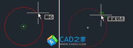 還有一些情況下,由于捕捉選項之間是有優先級設置,只有用TAB鍵才能切換到我們需要的捕捉選項。例如我們同時打開了圓心和切點的捕捉選項,我們在畫直線時要先定位它與相切,然后再去確定他的下一點,也就是說我們要利用遞延切點捕捉。由于圓心優先于遞延切點,光標放到圓上時,只能捕捉到圓心。除非我們將圓心捕捉選項關掉,才能直接捕捉到遞延切點,此時如果知道用TAB鍵的話就好辦了,如下圖所示。