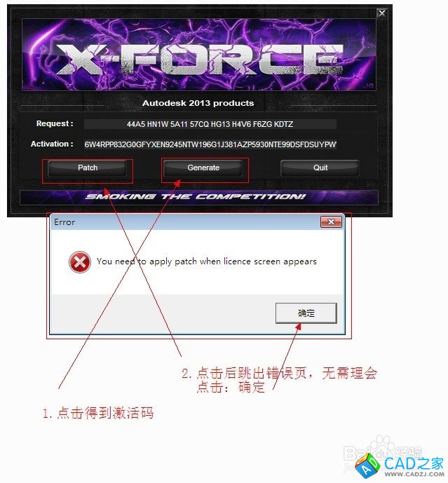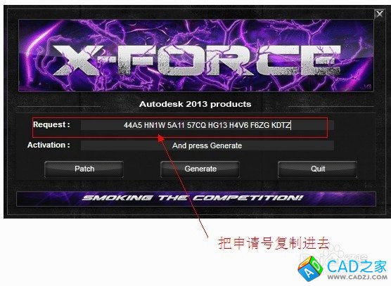 以“管理員身份”運行注冊機。首先,將激活界面的申請號填至注冊機中的Request中(注意:務必校核無誤);然后,點Generate算出激活碼,并點擊Patch予以確認(這是必須的:否則將提示激活碼不正確);最后,復制Activation中的激活碼,粘貼(組合鍵:Ctrl + V)至界面“輸入激活碼”欄中,點擊“下一步”即大功告成順利激活!