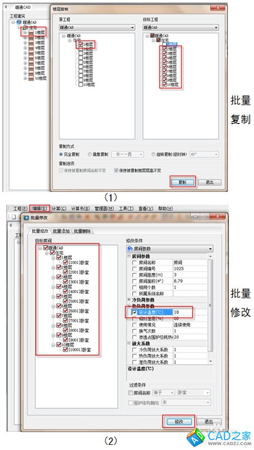 以臥室負荷計算為例,右鍵點擊1樓層,選擇高級復制,選擇目標工程的2~10樓層,依次點擊復制、確定、退出,這樣就實現參數共享。