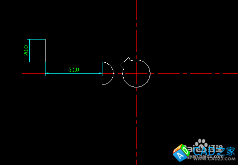 沿著半圓的上面端點(diǎn)依次畫水平50mm直線,豎直20mm直線。