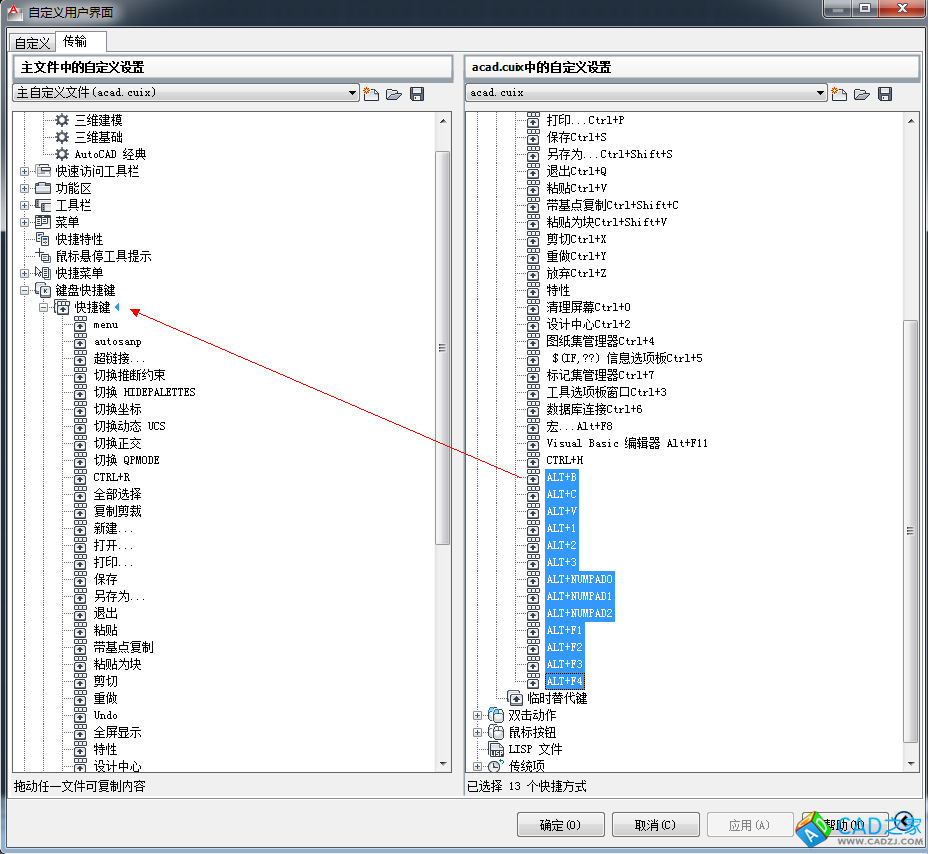 現(xiàn)在這幾個(gè)Alt 快捷鍵就被傳輸?shù)疆?dāng)前自己使用的菜單中了,回到自定義選項(xiàng)卡查看下,請(qǐng)注意,右側(cè)的快捷鍵,不要嘗試去修改它,AutoCAD不允許你定義Alt+B 這類快捷鍵,會(huì)自動(dòng)刪除掉,但是你不動(dòng)它,也會(huì)被保存下來(lái)。至于其它欄,可以根據(jù)自己的需要去修改。下面有個(gè)元素ID是AutoCAD自動(dòng)分配的,上面編輯acad.mnu菜單那一步,你如果偷懶快捷鍵定義不同,而命令相同的話,實(shí)際上分配到的ID是一樣的,這時(shí)候再去修改這個(gè)命令,你會(huì)把所有相同ID的項(xiàng)目,全部修改成一樣,從而無(wú)法實(shí)現(xiàn)不同的快捷鍵調(diào)用不同命令。
