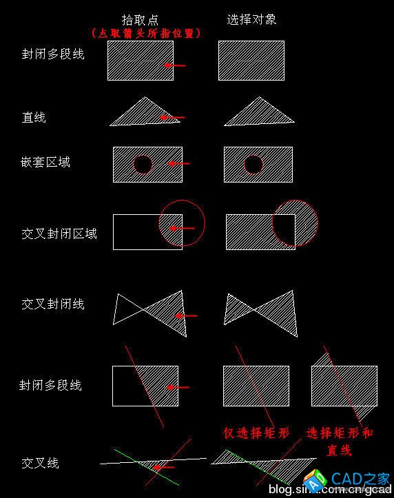 在上面的圖中簡單地列舉了幾種情況,從填充效果來看,拾取點的方式明確地指定了要填充的區域,結果比較好把我,而且適用于絕大多數情況;選擇對象則要求相對較高,邊界最好是封閉多段線,如果不是多段線,需要正好構成一個封閉區域。選擇交叉不封閉的線時也可以填充,但結果會很奇怪。正因為這樣的原因,大部分人都采用了拾取點的方式來創建填充。