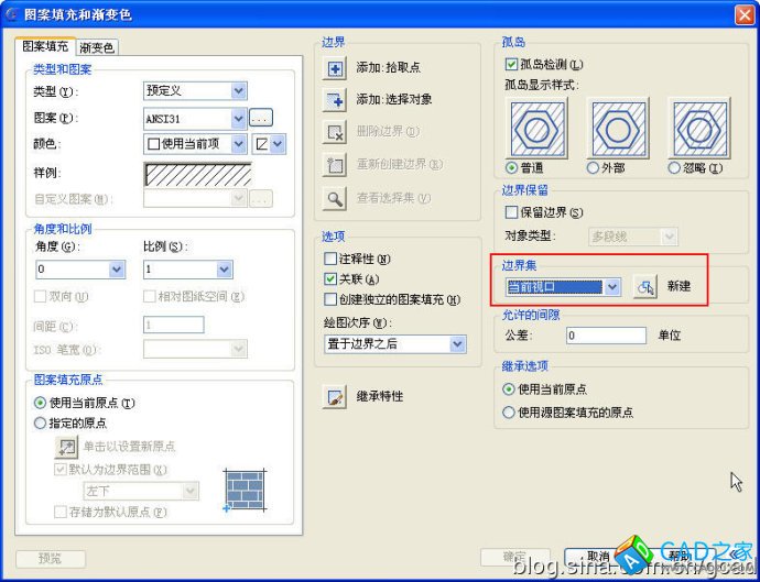 要選擇使用哪種方式進行填充,除了要了解在不同情況下兩種方式的填充效果外,還需要了解兩種填充的計算方式。當使用拾取點方式選擇填充區域時,CAD軟件會在視圖范圍內進行搜索和計算,最終算出一個合理的區域。當視圖里顯示的圖形很多,而且如果圖形比較復雜,比如有很多圓、弧、樣條線、而且之間有很多交叉、嵌套,計算區域會很慢,在CAD低版本會直接提示對象太多,計算量大,是否繼續,CAD高版本進行了優化,但仍然會很慢。而選擇對象則不同了,CAD只需計算這些選擇的對象是否構成封閉區域,是否嵌套等等,計算量會小得多。因此當圖形比較復雜的時候,如果滿足選擇對象進行填充的條件,盡量使用選擇對象的方式;如果只能使用拾取點的方式的話,可以盡量將視圖放大,讓視圖里顯示的對象少一點,或者通過選擇對象來構建“邊界集”,然后再拾取點。如下圖所示,默認的邊界集是當前視口,放大視圖和建立邊界集的目的都是減少參與計算的圖形數量,