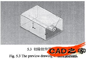 單擊特征工具欄中的拉伸凸臺/基體工具按鈕,設置拉伸距離為70mm,完成實體的拉伸。單擊選擇工具,選取閥體的右側面,并單擊標準工具欄中的正視于工具,在此基準面上繪制一直徑為16mm的圓,并用標注工具定義其圓心位置,然后選擇特征工具欄的切除拉伸工具,設置切除深度為16.5mm,切除拉伸后的外形如圖5.3所示。